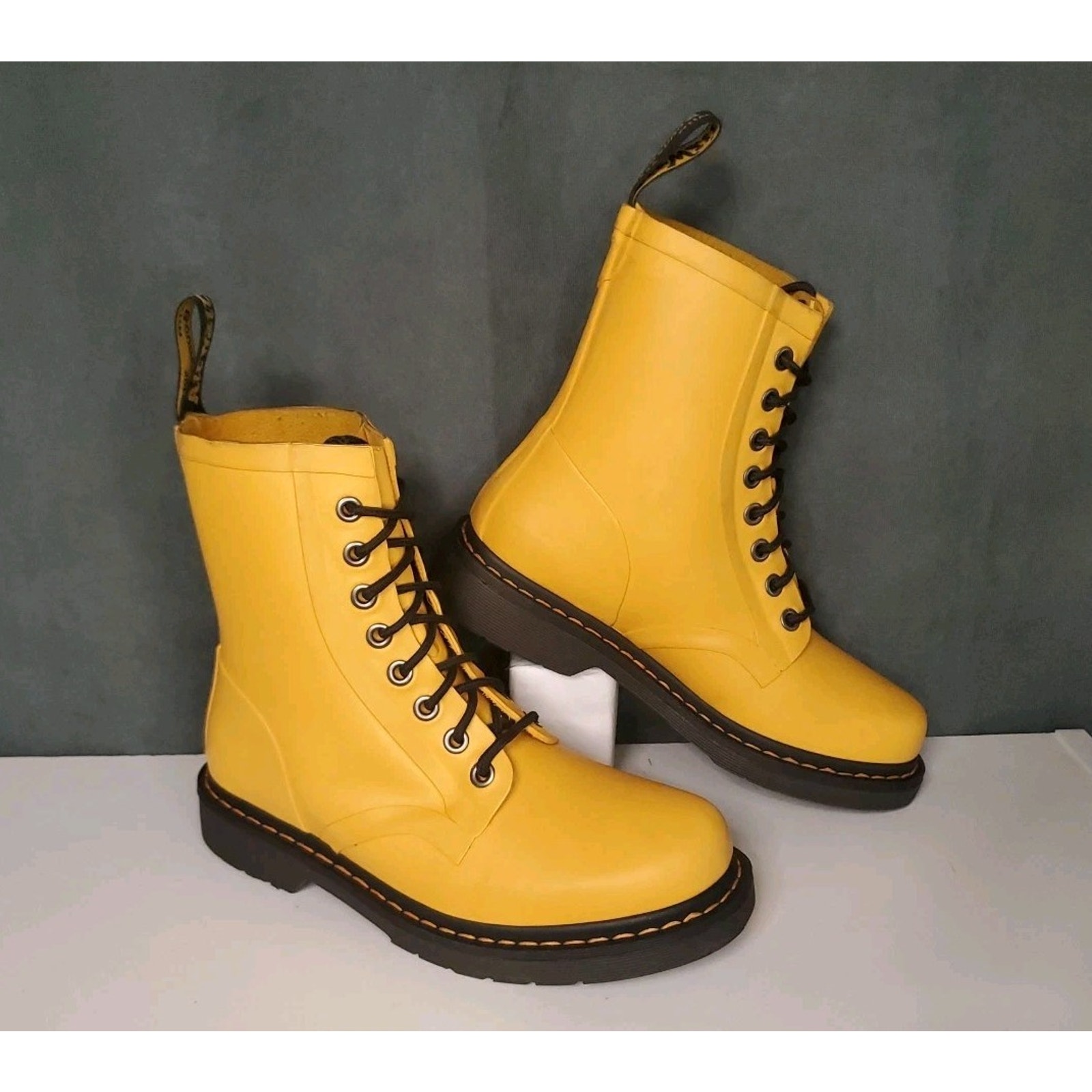 Used in good condition with some signs of wear. Some minor damage to the tongue area on both boots--not visible when worn. See pics for details and let me know if you have any questions. Sanitized and shipped fast from Texas--thanks for looking y'all! Dr Martens Drench 8-Eye Yellow Rain Boots Vulcanised Rubber US Womens 7