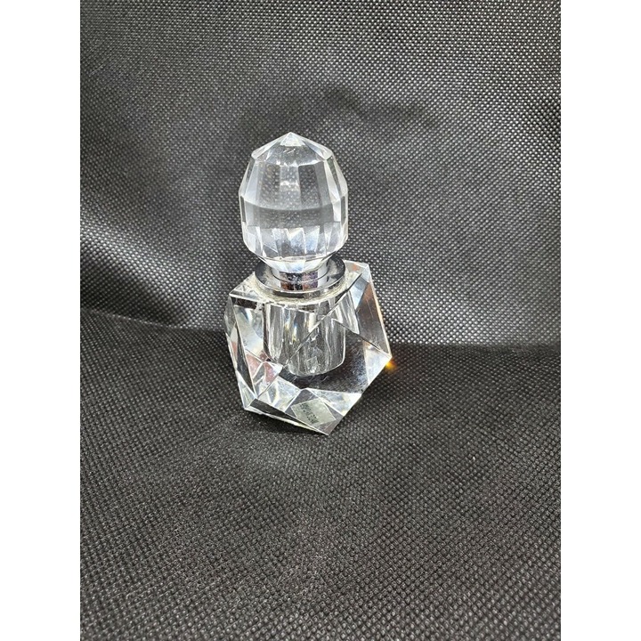 crystal perfume bottle, small glass perfume bottle, gold trim collectible bottle, vintage vanity decor, elegant perfume bottle, cut glass perfume container, collectible fragrance bottle, ornate vanity piece, antique-style perfume bottle, crystal glass decor