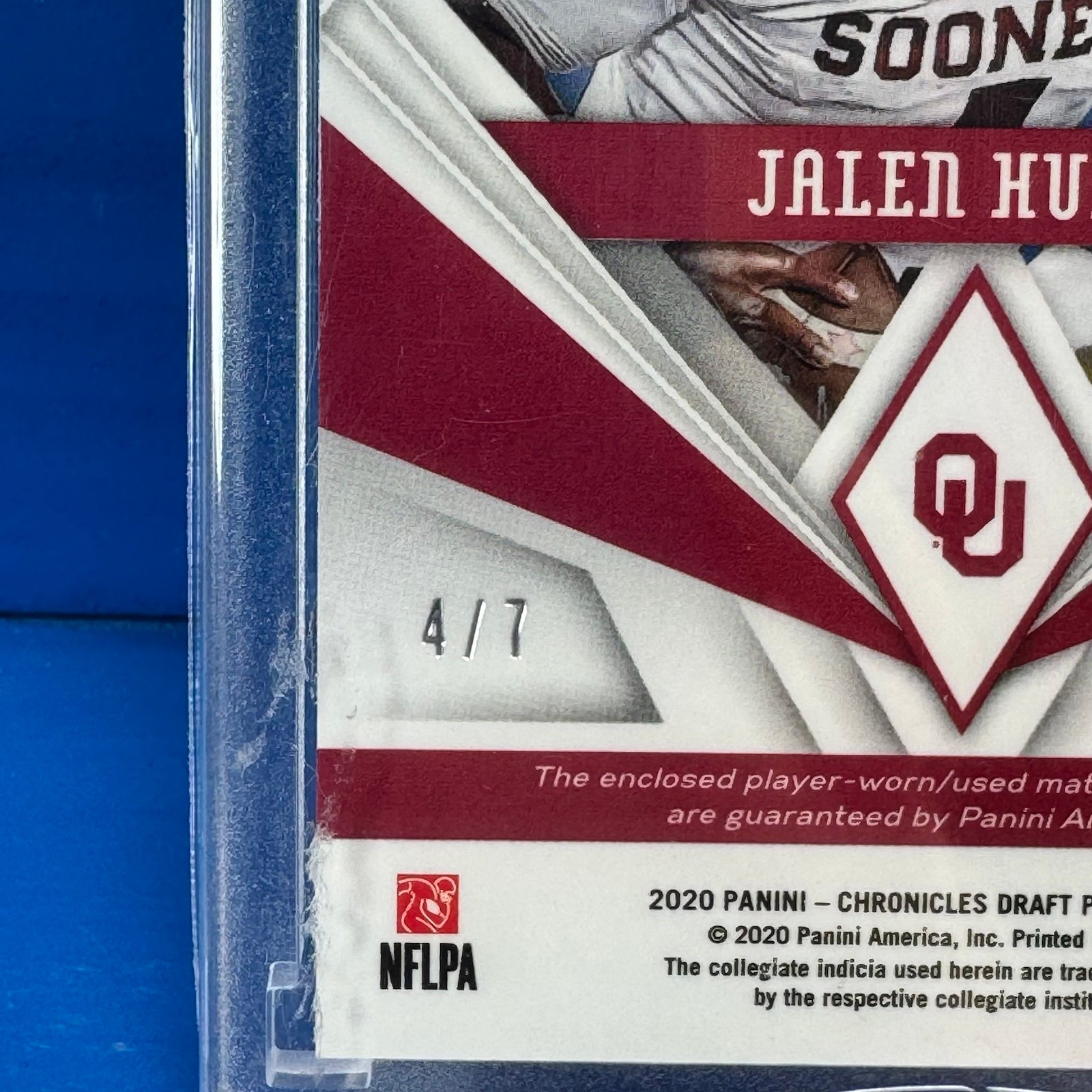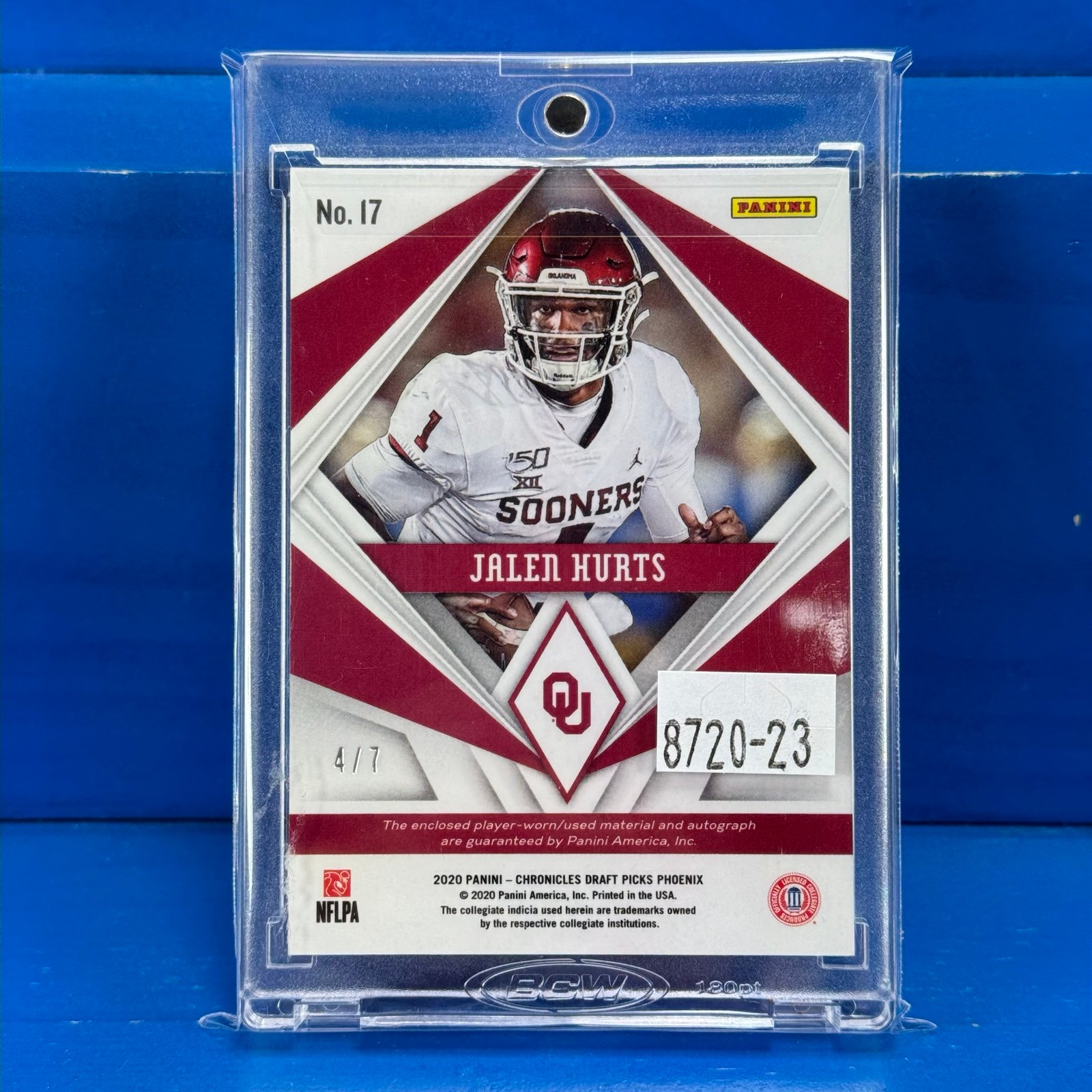 Jalen Hurts (Philadelphia Eagles & Oklahoma Sooners) 2020 Panini Chronicles Draft Picks Collegiate Football Trading Card #17 "Phoenix Draft Picks Patch Autographs" Psychedelic Super Short Print SSP Parallel Numbered 4/7. Ultra Rare RPA with SICK Chick-Fil-A Bowl Game Patch!