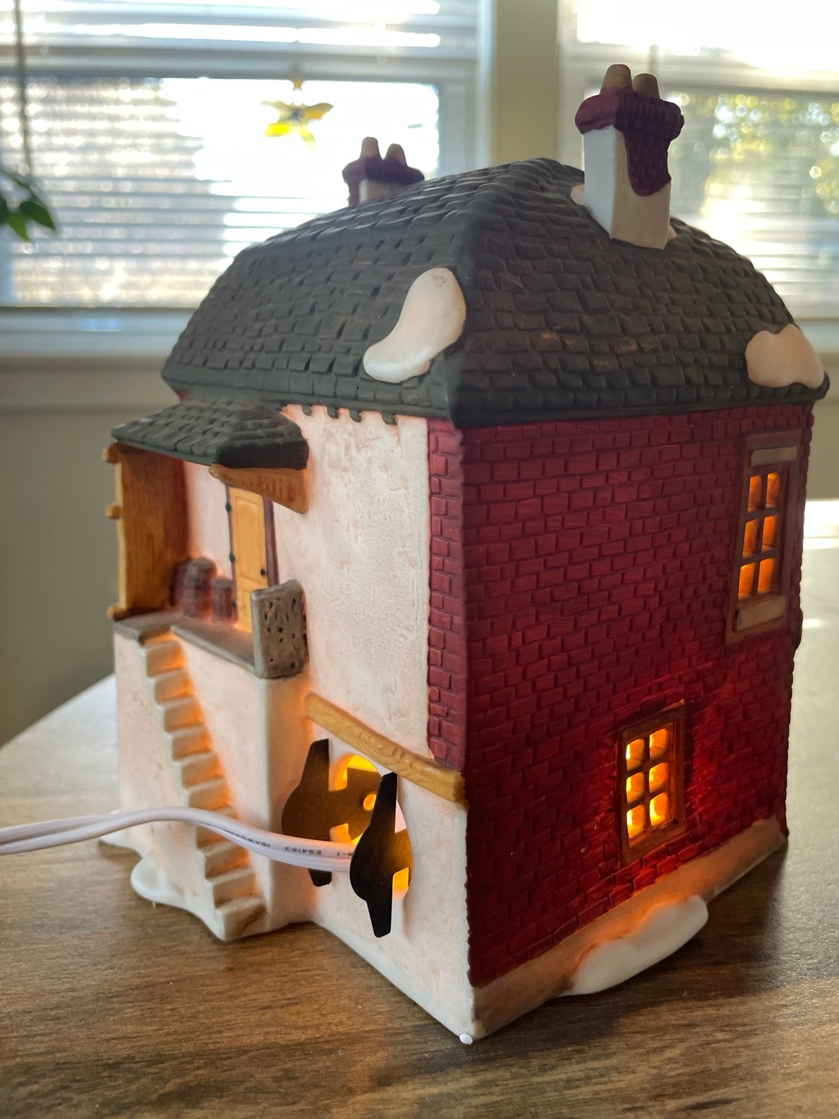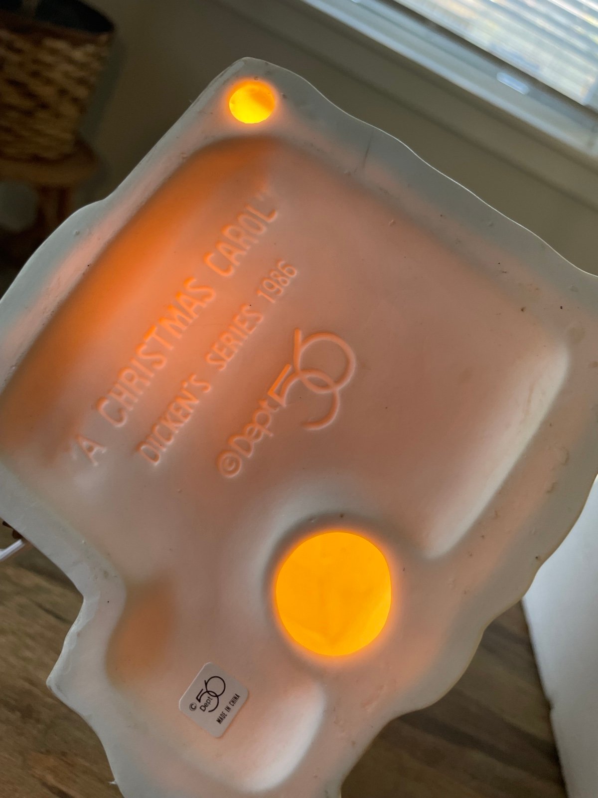 This is a part of the Dickens Series by Department 56. It is in great condition and would make a perfect addition to your Christmas decor! It is hand painted porcelain. It measures *roughly* 4 x 4 x 6''. It was released in 1986. The lighting cord is removable. While it doesn’t come with the box, it does have the styrofoam part to help protect it during storage.