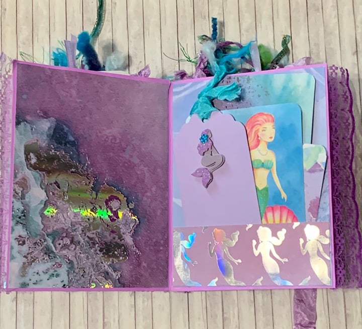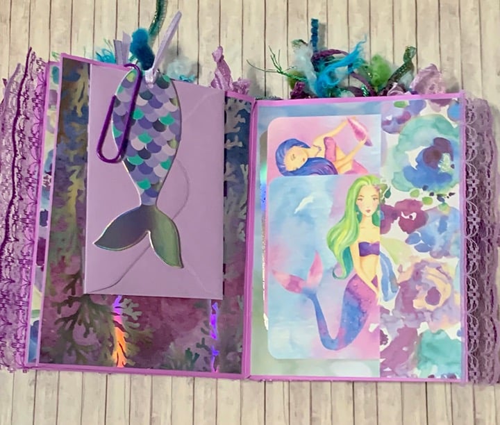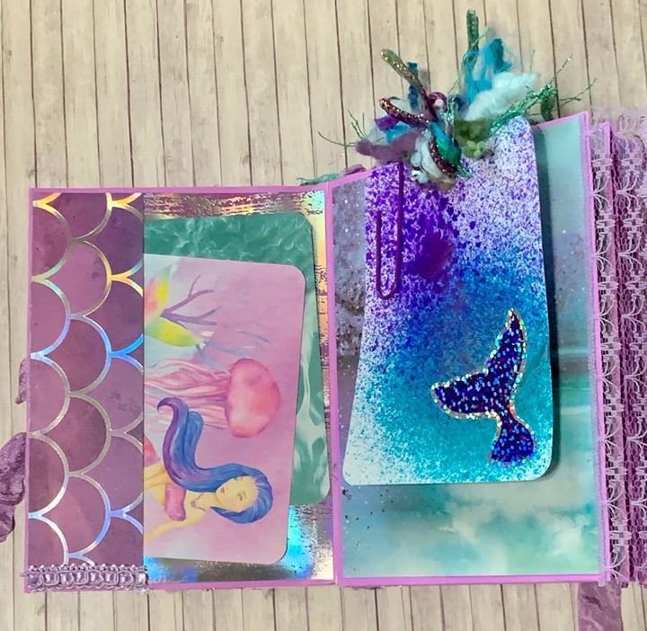 This extra thick mermaid themed journal is packed full of beautiful embellishments to include two lovely ink sprayed cards and stamped tags as well as 14 pockets/tucks, two envelopes and clips. There are 56 journal cards/tags in all. It has a built in ribbon tie. The journal measures 5.5" tall X 4" wide. It has 14 pages/28 front & back (including front/back covers).
