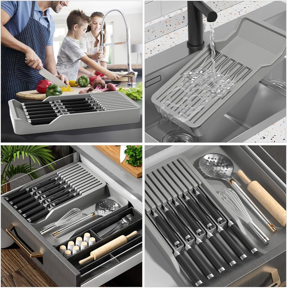 • Drawer Knife Organizer: The knife rack has different compartments or slots to accommodate different types of knives, allowing you to easily organize your kitchen knives and improve kitchen efficiency