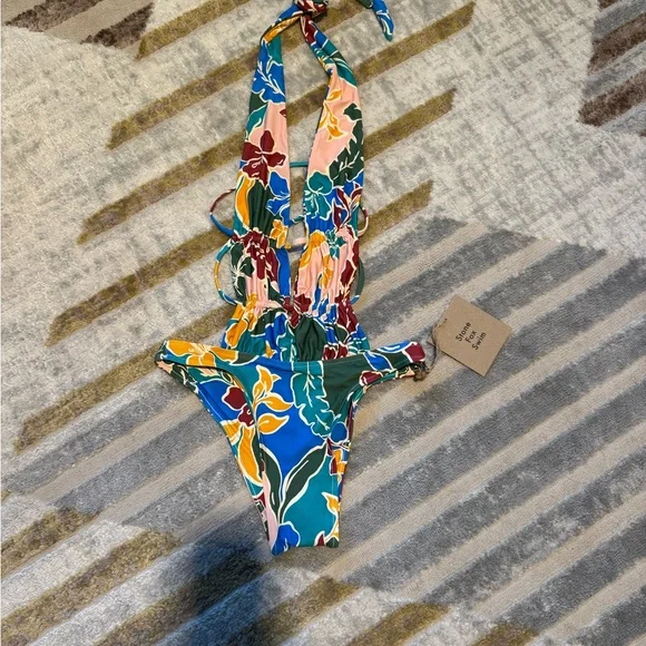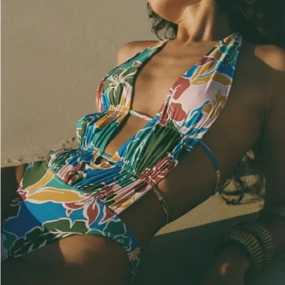 Vibrant halter swimsuit with a tropical print. Features a mix of blue, green, red, and yellow colors. Perfect for beach days.