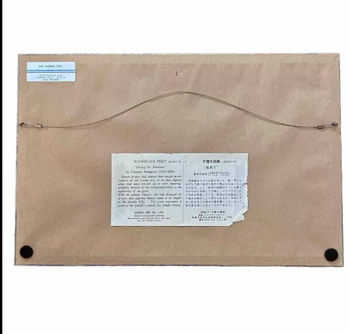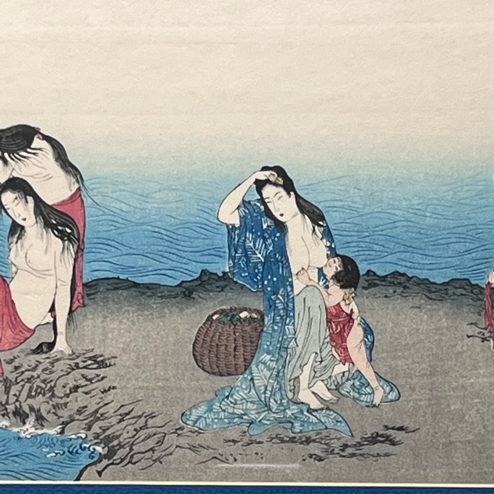 The original block print image(s) was presented in three panels, a triptych. The composition of fisherwomen who dive for abalone is among the most well known triptychs in all of Ukiyo-e (a genre of Japanese art). Kitagawa Utamaro was a renowned Japanese printmaker and painter born in 1753 in Yoshiwara, Edo (present-day Tokyo). Kitagawa made block prints referred to by the Japanese as pictures that float on air.
